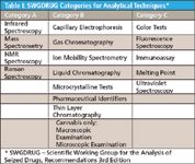 According to the Scientific Working Group for the Analysis of Seized Drugs (SWGDRUG), techniques with the highest discriminating power should preferentially be used for forensic identification of seized drugs. Table I shows the analytical technique categories listed in order of decreasing discriminating power from A to C. SWGDRUG recommends at minimum that when a Category A technique is used, at least one other technique of any category must also be used. In practice, many drug labs choose GC–MS since this addresses the recommendation and they get credit for the two techniques — MS (Category A) & GC (Category B). However, this recommendation is a minimum and many labs are finding that GC–MS is not always the best choice for the particular sample they are analyzing.