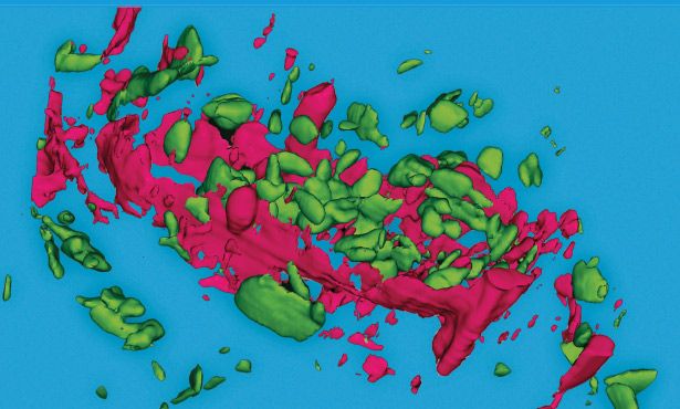 The confocal microscope setup enables the generation of 3D Raman images by stacking 2D images of a series of focal planes. Here, a pressed piece of banana pulp mixed with water was investigated with an alpha300 Ri inverted confocal Raman microscope (WITec). The scan range was 300 × 200 × 90 µm3 with 450 × 300 × 45 pixels. At each pixel a complete Raman spectrum was acquired. The integration time was 34 ms/spectrum. The 3D reconstruction of the Raman image stack (Figure 1) shows starch grains (green) and cell wall components (red).