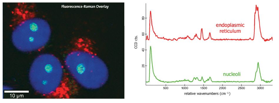 Though strong fluorescence is the "natural enemy" of the weaker Raman signal, correlative fluorescence–Raman imaging using one microscope is possible by choosing a suitable laser wavelength, to avoid signal overlap. Kidney cells (Vero ATCC CCL-81) were grown in a petri dish. Nuclei were stained with DAPI. Cells were imaged in aqueous solution under the alpha300 Ri microscope with a laser wavelength of 532 nm. An image of 50 × 40 µm2 with 150 × 120 pixels was generated. The acquisition time was 0.2 s/spectrum. The resulting correlative Raman–fluorescence image shows the nuclei (blue) imaged by fluorescence microscopy and the nucleoli (green) and endoplasmic reticula (red) imaged by confocal Raman microscopy based on their Raman spectra (Figure 2). The fluorescent dye does not interfere with the Raman measurement.