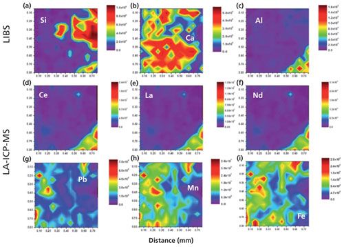 Figure 6: Simultaneously obtained 2D LIBS surface maps of a bastnäsite rock sample using LIBS and LA-ICP-MS. (a–c) LIBS elemental maps of Si I (288.1 nm), Ca II (315.9 nm), and Al I (308.2 nm). (d–i) LA-ICP-MS maps of 140Ce, 139La, 146Nd, 208Pb, 55Mn, and 57Fe. (Adapted with permission from reference 27.)