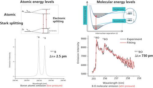 Figure 8: Energy diagram of 2s2 2p 2P01/2, 3/2←2s2 2p 2D5/2,3/2 electronic transitions of atomic boron is shown on the left. The measured 11B and 10B isotopic shift for this transition is 0.46 cm-1 or 0.002 nm. The measured shift for the BO transition B2Σ + (ν = 0) → X2Σ + (ν = 2) is 113 cm-1 or 0.73 nm. (Adapted with permission from reference 39.)