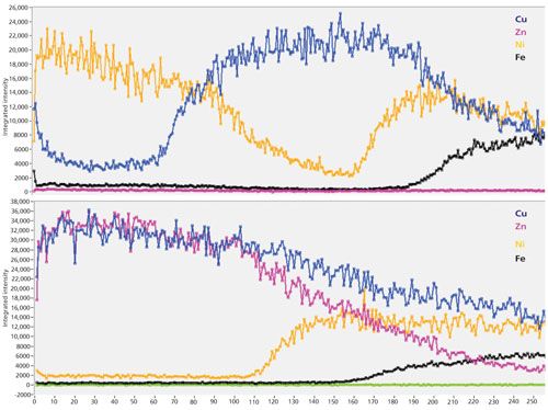 Figure 7 shows an example of depth profiles by LIBS (as of signal intensity versus number of laser shots) of two different layered metal samples containing copper, nickel, zinc, and iron (substrate). Similar to classical quantification approaches, these profiles can be easily related to layer thickness if a standard material with known thickness is available and is analyzed using the same experimental conditions.