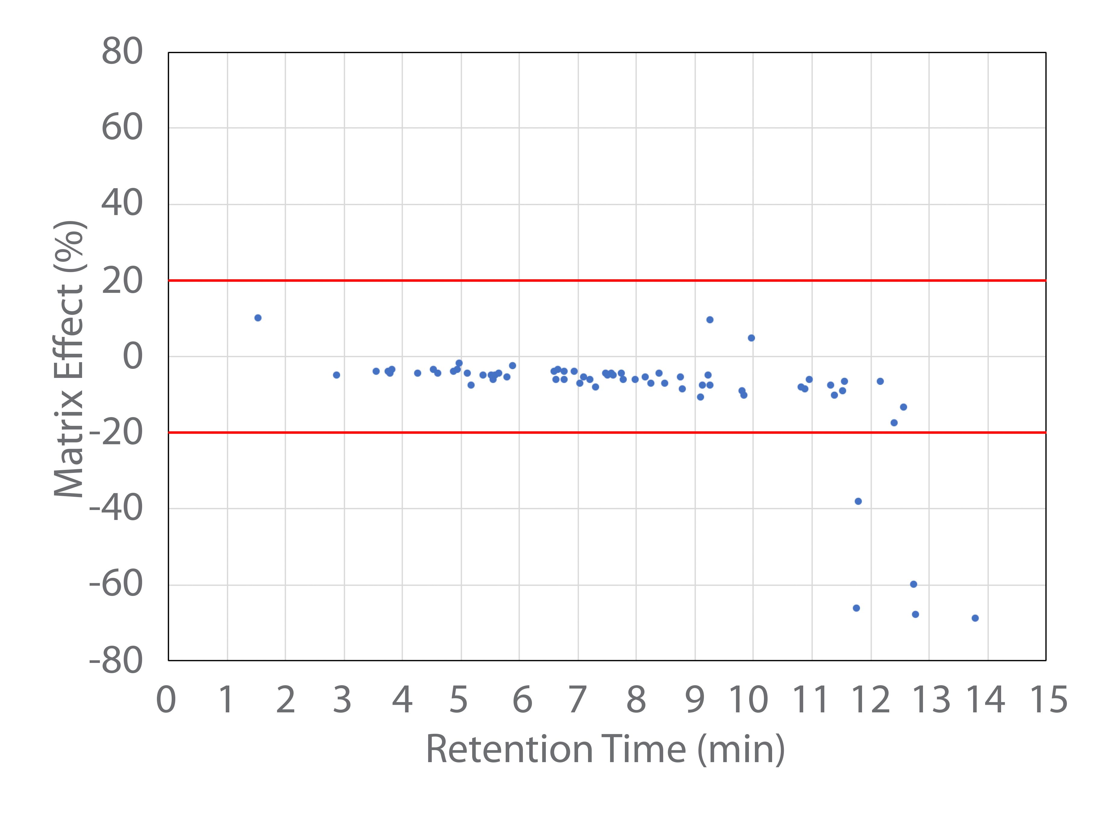The hydrophobic nature of the MCT oil matrix can lead to significant matrix effects. The ion suppression or enhancement was therefore calculated on the signal of the 62 pesticides and 5 mycotoxins analyzed with the ESI source. The calculation was performed by taking the difference between the signal of the analyte in the matrix and clean solvent, and dividing it by the signal in clean solvent. Figure 1 shows these calculated matrix effects as a function of the analyte retention time on the column. Among the 67 analytes measured with the ESI source, only 3 showed slight signal enhancement, while the rest showed signal suppression effects. Since the MCT oil cannabis tincture matrix is very hydrophobic, significant matrix ion suppression effects of <-20% were only observed for five late-eluting analytes. For those analytes measured with the APCI source, the matrix effects were insignificant (between -20 to 20%) for four analytes. It is generally understood in the literature that fewer matrix effects are observed with the APCI source in comparison to the ESI source (10–12).