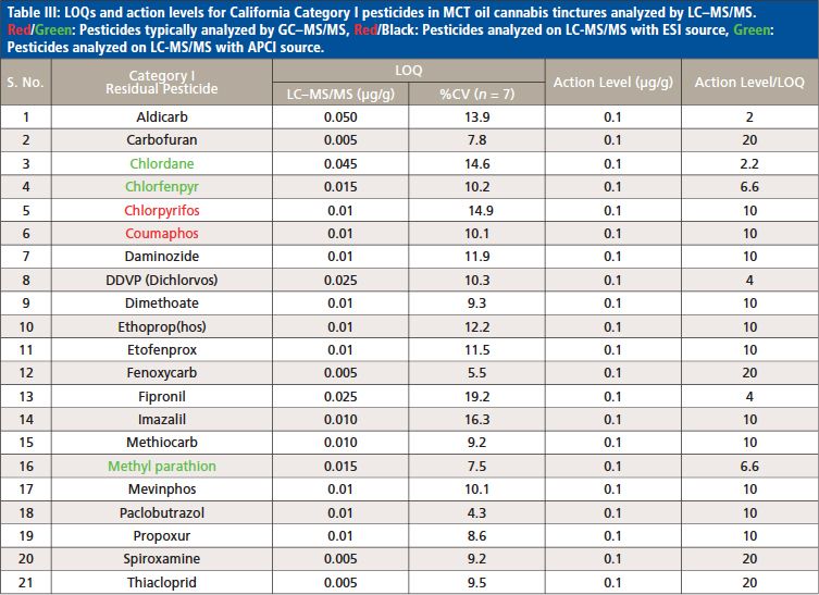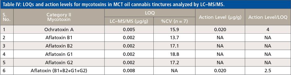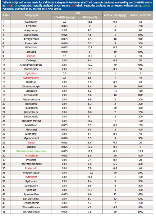 With this LC–MS/MS method, 62 out of 66 pesticides and 5 mycotoxins were analyzed using the ESI source, and the remaining 4 pesticides regulated by the State of California were measured with the APCI source. According to the California Bureau of Cannabis Control’s text of regulations, the 66 pesticides are divided into categories I and II. Category I pesticides are banned for use on cannabis, due to the risks they present to human health and the environment, whereas category II pesticides are eligible for use on cannabis plants. This categorization reflects the varying action limits and corresponding limit of quantitation (LOQ) requirements for these pesticides and five mycotoxins in different cannabis-related products (4). The LOQs and response reproducibility at LOQ level for each of the pesticides categorized and mycotoxins in MCT oil cannabis tinctures are summarized in Table II, III and IV. The LOQs were determined by ensuring that the signal-to-noise ratio for each analyte was greater than 10. The response relative standard deviation (RSD) for each pesticide and mycotoxin at its LOQ level in the cannabis matrix was less than 20% for seven replicates. As demonstrated in Tables II–IV, the LOQs determined in this study are well below the California action limits (by a factor of 1.5 to 8000) for all of the analyzed pesticides and mycotoxins. This shows that the method is sufficiently sensitive and reproducible for pesticide and mycotoxin analysis in MCT oil cannabis tinctures at the regulatory limits specified by the State of California. In addition, the matrix-matched calibration curves showed excellent linearity for all of the analytes in the tinctures with coefficients of determination (R2) greater than 0.99.