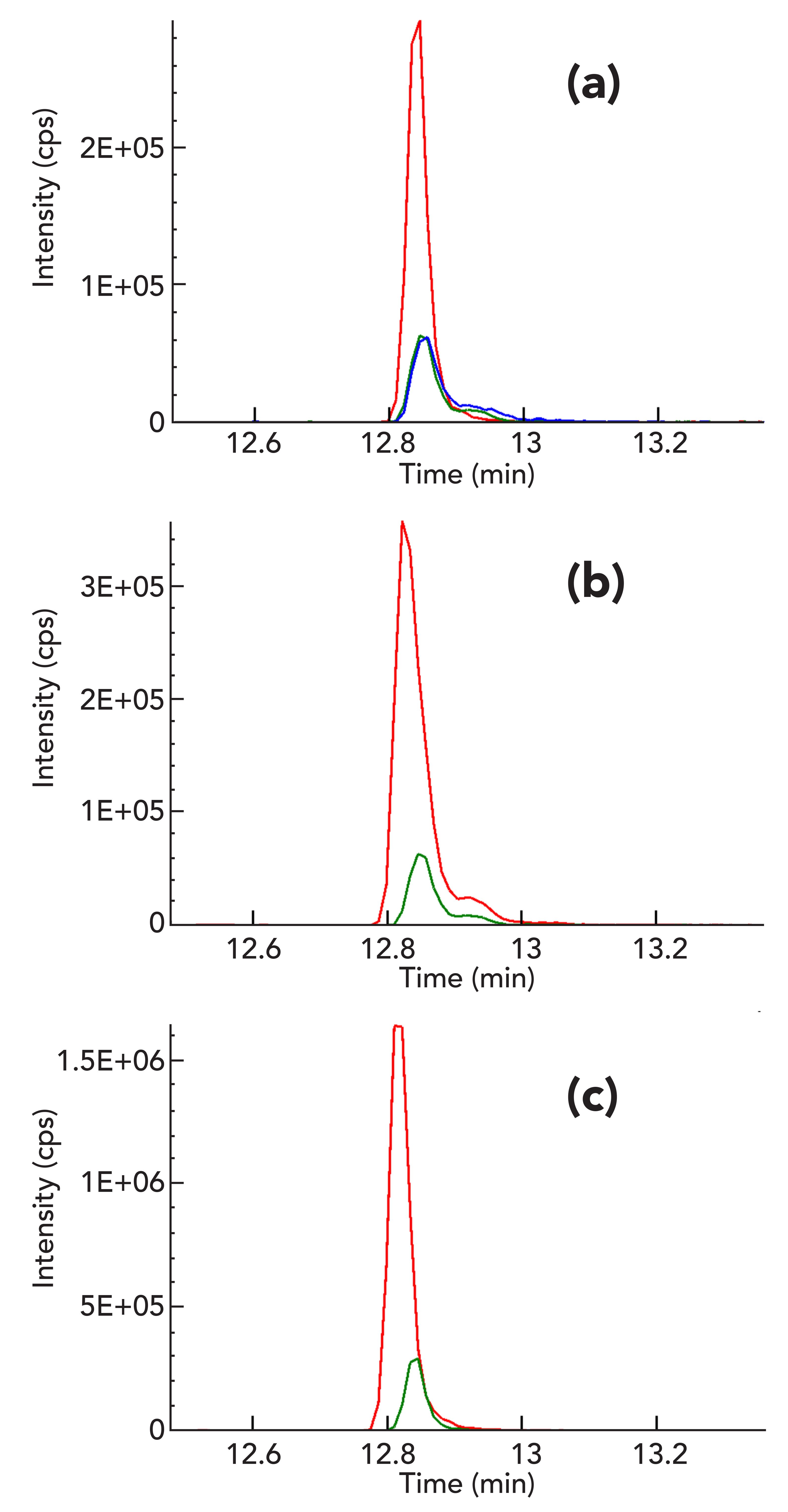 Figure 2: (a) Overlay of response of bifenthrin in solvent (red) and MCT oil cannabis tincture matrix spiked with bifenthrin before (green) and after (blue) extraction without any internal standard. The response ratio (RR) of bifenthrin spiked in cannabis tincture matrix before extraction to solvent standard was 0.29. The response ratio of bifenthrin spiked in cannabis tincture matrix before and after extraction was 0.96. (b) Overlay of response of bifenthrin (green) and bifenthrin-d5 internal standard (red) in pre-spiked cannabis tincture matrix with a RR of 0.168 for analyte to internal standard. (c) Overlay of response of bifenthrin (green) and bifenthrin-D5 internal standard (red) in solvent with a RR of 0.167 for analyte to internal standard.