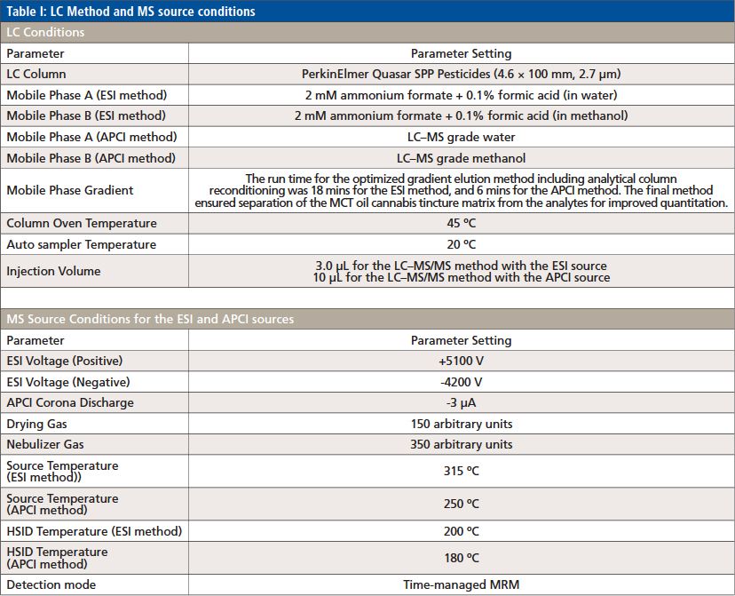 Analysis of 66 pesticides and 5 mycotoxins regulated by the State of California in cannabis tinctures were analyzed using LC–MS/MS with an ESI source, and LC–MS/MS with an APCI source. A simple, fast, and cheap acetonitrile solvent extraction method was used for sample preparation for good recovery and high throughput, and internal standards were used to compensate for ion suppression effects from the hydrophobic matrix.