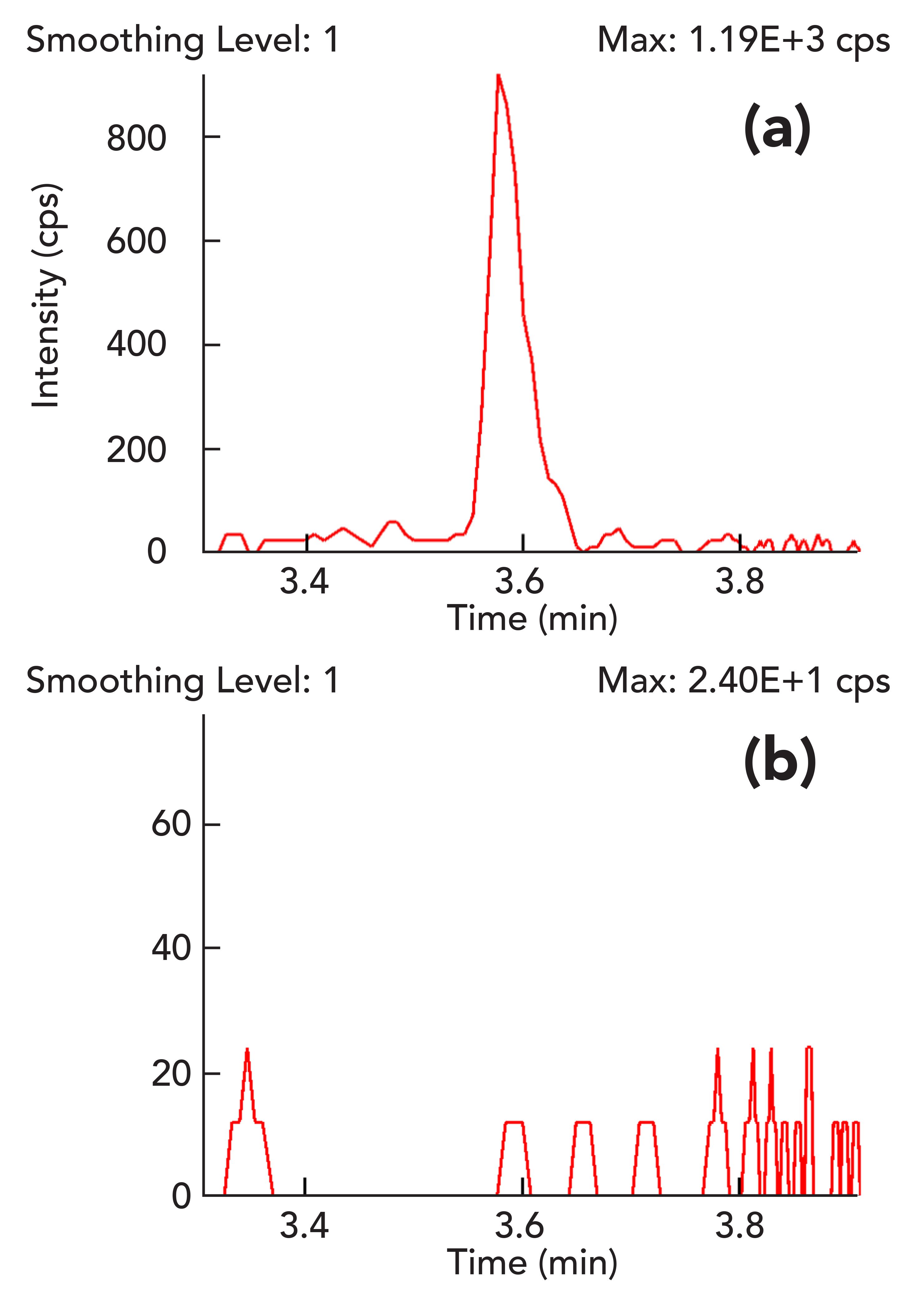 Figure 3: The response for PCNB in (a) a cannabis tincture matrix spiked at a level of 0.045 µg/g and (b) a blank cannabis tincture matrix.