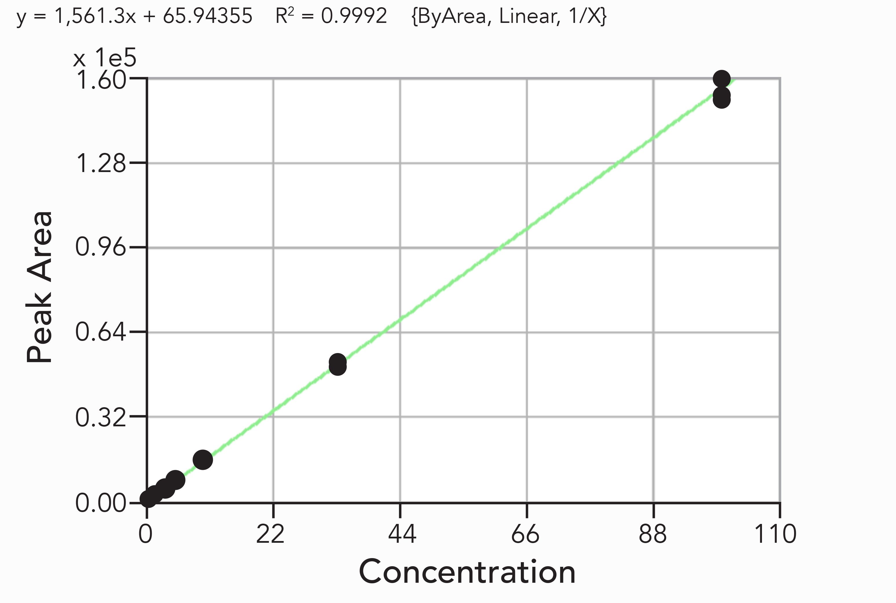 Figure 4: Linearity of PCNB response over a concentration range of 0.5-100 ppb in 30-fold diluted cannabis tincture extract. y = 1,561.3x + 65.94355; R2 = 0.9992 (ByArea, Linear 1/X).