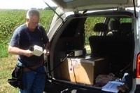 Limited battery life, operator strain (repeated bending and standing), and decreased boll sampling efficiency were observed for the plant measurement system, especially when several samples and cotton varieties were to be sampled. For future evaluations, it was agreed that a more efficient process would be to gather the cotton bolls first from the plant, take the labeled bolls to a designated location in the field (for example, the tailgate of a truck or a nearby building), and measure the samples at the designated location. In year 2, measurements were performed either in the field (plant measurement) or on the back of a vehicle in the field or at a building located next to the cotton field ("vehicle measurement") (Figure 5). The vehicle measurement increased the sampling and measurement efficiencies and the operational capabilities of the NIR unit significantly. In the vehicle measurement, the cotton bolls are collected first in the field; the bolls are taken to the vehicle or nearby building, upon which the NIR unit has been set-up for the micronaire measurements; the NIR measurements are performed; and the samples bagged and tagged for later laboratory reference micronaire analyses. Field micronaire trials with the portable NIR analyzer were performed at St. Joseph, Louisiana (LA Extension Service field); Stoneville, Mississippi (ARS field); and Winnsboro, Louisiana (LA Extension Service field). At least 20 bolls of each variety were measured.
