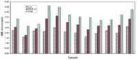 As mentioned previously, the lint samples (normally 1.0–2.0 g) of each lot had to be combined for HVI micronaire analyses (9.5 g minimum of fiber). A total of 44 HVI samples were obtained (low-medium-high lots for all but one variety) for the 15 lots collected in the fields. The combined high-medium-low samples were measured on the HVI, and their micronaire results were compared to the NIR prediction results (average of the NIR prediction results [high-medium- low] for the individual lint bolls combined to form the high-medium-low HVI samples). The preliminary NIR-HVI micronaire results for the seed cottons measured on the boll in the field (field–seed cotton component) were very encouraging, as shown for 12 of the varieties in Figure 6. Figure 6 represents the NIR-predicted micronaire values for the high-medium-low samples of the lots displayed, with the NIR correctly detecting the low-medium-high lot trend for the displayed samples. For all 15 lots, the trends in the HVI micronaire (low-medium-high) were correctly identified for over 80% of the HVI samples. All NIR measurements were made in nonstandard conditions (temperature, relative humidity, moisture, and so forth) and on seed cotton (fiber–lint still attached to the cotton seed). When one considers that the micronaire calibration used for the field–near field NIR measurements was developed for laboratory conditions and fiber–lint micronaire analyses, the degree of NIR–HVI method agreement on micronaire trends (high-medium-low micronaire) was indeed very encouraging.