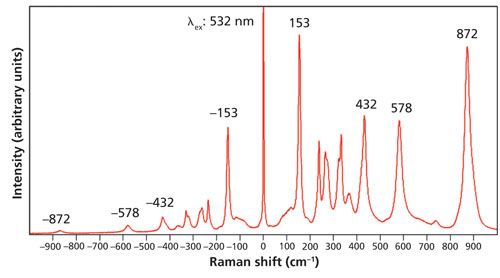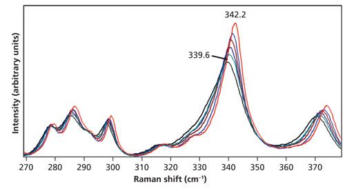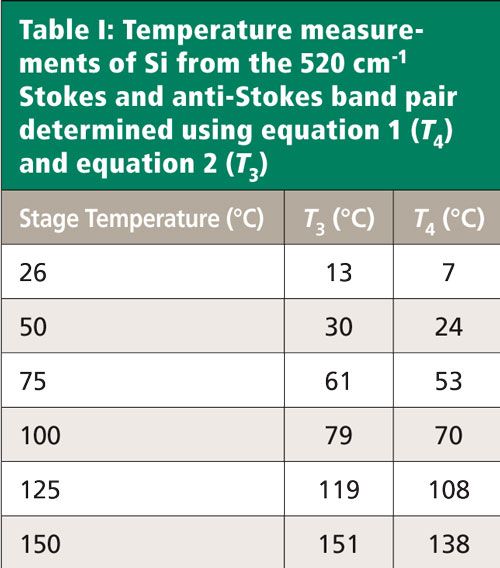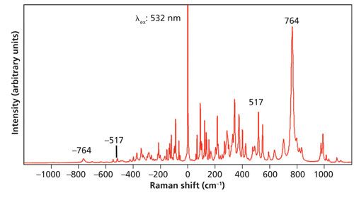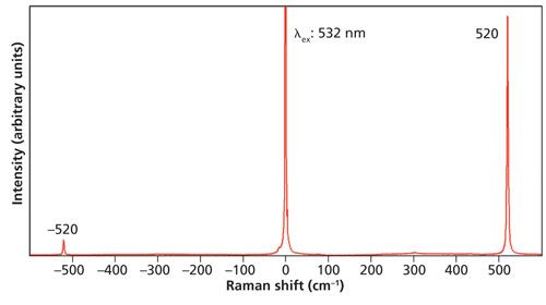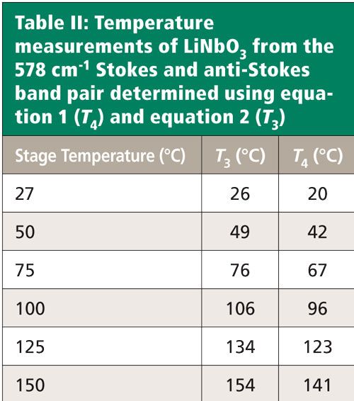 Raman spectroscopy is well known as an analytical method for identifying chemical compounds and characterizing the chemical bonding and solid-state structure of materials. Perhaps less well known is the fact that one can use Raman spectroscopy to determine the temperature of the material being analyzed. The temperature can be determined in one of two ways. If a Raman band is sufficiently narrow, the peak position can be seen to shift with temperature. As the temperature increases, the bond length will increase and consequently one can expect a decrease in the energy of the vibrational mode. Likewise, a decrease in temperature will lead to a shorter bond length and an increase in the energy of the vibrational mode. The increase or decrease in bond length causes a change in the vibrational force constant, which results in a shift of the Raman peak position. A second way of determining the temperature is to measure the signal strengths of a particular Raman band at the Stokes and anti-Stokes positions and calculate the temperature based on a Boltzmann distribution of the ground and first excited state populations. The expressions most frequently given to describe this relationship are shown in equations 1 and 2 (1):