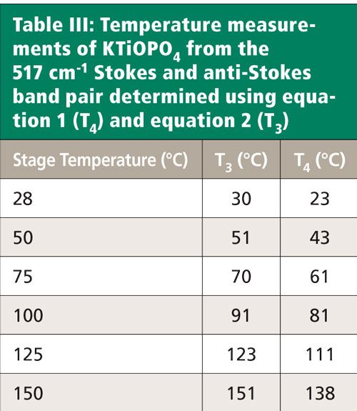 The temperatures determined using equation 2 (T3) rather than those of equation 1 (T4) are closer to those of the stage as set by the controller. We would expect better agreement of T3 temperatures with those of the stage controller because our detection is with a CCD photon counting device. However, the differences between the stage temperature and T3 are significant below 100 °C. There is much better agreement at 125 °C and 150 °C. Of course, these are only single spectra and a statistically significant number of spectral measurements should be made when determining the temperature of a material.