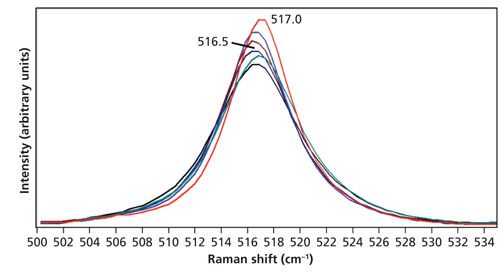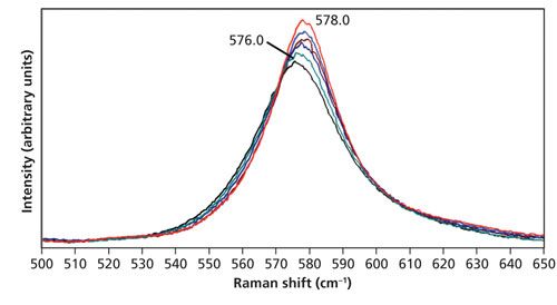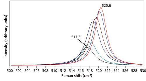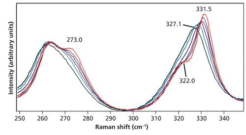 There are several important observations to make from these measurements. First is the significant drop in Stokes signal strength as the temperature increases. The corresponding anti-Stokes bands (not shown) manifest an increase in signal strength with increasing temperature. The second observation is the shift of the Raman band to lower energy with increasing temperature. This shift can be understood as the bond length increasing with temperature and a commensurate reduction in the chemical bond’s vibrational force constant. Consequently, one can use the peak position of a specific Raman band for a particular material as a measure of the temperature. Of course, the peak shift method requires the accurate control of the reference material’s temperature, and perhaps measurement by independent means, to calibrate the Raman spectra as a method of temperature measurement.