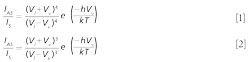 where T is the temperature, k is Boltzmann’s constant, h is Planck’s constant, vl is the frequency of the laser, vv is the frequency of the vibrational mode (Raman band position), and the Stokes (IS) and anti-Stokes (IAS) Raman scattering strengths are based on energy detection of the signals. The means of experimentally detecting the Stokes and anti-Stokes Raman scattering is very important. The use of equation 1 is appropriate when spectra are acquired with energy-based detection, whereas equation 2 should be used when photon counting is the basis for detection (2,3). The spectra reported here were all acquired using a charge-coupled device (CCD) detector, a photon counting device, so equation 2 is more appropriate for the analysis of our data. An additional point about units should be clearly understood. Planck’s constant is in units of J·s and Boltzmann’s constant is in units of J/K. Therefore, vv must be in units of s-1 for units to cancel providing T in degrees Kelvin when rearranging equations 1 and 2 to calculate T.