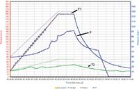 Figure 1: UltraWAVE digestion program with 5 x 0.75 g heavy oil: ramp to 250 °C over 30 min and hold for 10 min. The line T1 shows the actual digestion temperature achieved. The applied microwave power is automatically controlled by the system so the actual digestion temperature precisely follows the programmed temperature profile. The outer temperature of the reaction chamber also monitored (T2). Note that pressure (P) reached almost 100 bar during the run. This is due to the high weight and high organic content of the samples, which generates NOx and CO2. Pressure was released automatically at 55 min.