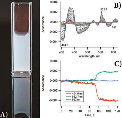 Features of all the expected chromophores (cytochrome c, b, a3, etc.) appeared and changed as the oxygen concentration fell to zero. Kinetic changes at three wavelengths are shown as Figure 1c.