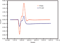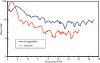 The detection of a small amount of contaminant in fuel (such as gasoline or diesel) is of practical importance. This can be conveniently done by terahertz measurements. For example, the detection of chromium salt in regular gasoline was attempted. Chromium(III) acetate hydroxide (CrAH, [CH3CO2]7 Cr3 [OH]2) (Aldrich) was dissolved in gasoline at 1.9105 mg/mL. A rectangular cuvette with a volume of ~1.5 mL and a pathlength of ~1 mm was used to introduce both the pure and CrAH-contaminated samples in the beam path. Time-resolved spectra of both pure and mixed gasoline are shown in Figure 8. It is seen that gasoline alone has a higher transmission compared to the CrAH contaminated one. Figure 9 shows the Fourier transform frequency spectra corresponding to the interferogram of Figure 8. There are significant identifying features in the respective spectra that can be exploited for discerning the contaminated gasoline from the uncontaminated one. An interesting observation is that at low frequencies (below ~1.5 THz, Figure 9, red curve) gasoline exhibits higher transmission than CrAH-contaminated gasoline (blue curve). However, at higher frequencies (above ~1.5 THz) gasoline exhibits a lower magnitude than that of the CrAH-mixed gasoline (Figure 9). Thus, the frequency-dependent behavior of the two specimens reveals some interesting molecular interaction between the CrAH and gasoline that needs to be investigated further for molecular level conclusions.