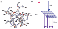 Here, a nanomaterial called dendrimer plays an important role by enabling monolithic photonic integration (2). Terahertz generation from dendrimer exploits its one special property, that is, its multifunctional molecular architecture that is capable of being doped by chromophores and thereby creates a high second-order susceptibility (χ(2)) material, termed an electro-optic dendrimer. The process is described elsewhere (3), and suffice it to mention here that more than 5 mW continuous wave (CW) terahertz power has been obtained with very high stability. Such a source is suitable for spectroscopy applications. Furthermore, a wide broadband terahertz range of up to >30 THz has also been possible (4), which is important for probing closely spaced molecular phenomena. The key property of dendrimer is the ability to create a dipole moment distribution via the distribution of charge centers in a doped dendrimer molecule (see Figure 1): μ(r) = Ql(r), where μ is the dipole moment and Q is the charge. Note here that l, the separation between the charge centers, is not fixed but is a function of the coordinate, l(r), of the charge centers themselves. Consequently, the energy level diagram in Figure 1b has multiple quasi states within the bandgap. When excited by a suitable pump laser combination, this dipole moment distribution generates a wide-range terahertz radiation via broadband emission. This is termed the dendrimer dipole excitation (DDE) process. A spectrometer was designed based on this principle and has been described elsewhere (4).
