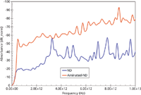 Figure 11: Broadband terahertz absorbance spectra of nanodiamond and amine-terminated nanodiamond obtained via Fourier analysis of the temporal signals (not shown). The aminated nanodiamond exhibits significantly higher absorbance.