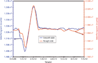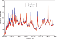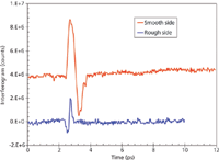 The Department of Homeland Security (DHS) sample was received courtesy of Dr. John Wilkinson from the Naval Surface Warfare Center Research Department in Indian Head, Maryland. The supplied sample is a common pharmaceutical compound that is not flammable or caustic, but its exact molecular composition is unknown. The disk has a 2-in. diameter and its thickness is ~0.35 in. One side is smooth and the other side is roughened with 100 grit sandpaper (see Figure 5). Here, the objective is to generate terahertz spectra of the supplied sample in the reflection mode. Despite differences in surface texture, the detected spectra should be able to uniquely identify the compound. The spectrometer was reconfigured by adding optics for the purpose of reflection measurements where the terahertz beam was reflected off of the sample into the detection system. Figure 6 shows the temporal reflection signal from both smooth and rough surfaces. The pulses are generated by an arrangement where the detection system was kept close to the reflecting surface. The frequency-domain spectra corresponding to the pulses are shown in Figure 7. As can be seen, both spectra overlap consistently, indicating that the sample may be identified regardless of its surface texture. However, because these measurements were done keeping the sample in close proximity to the detection system, the effect of distance must be carefully calibrated to pinpoint the common features in the spectra. A protocol then must be worked out for remote identification of the actual chemical ingredients. In view of Figure 7, it is evident that the specimen under test (SUT) exhibits rich spectral features over the entire range of 0.1 to ~35 THz. After the spectral signature of the real (known) compound is established, then either a deterministic or a statistical model may be used to identify the ingredients from remotely measured spectra.