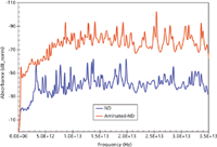 Nanodiamond (ND) is a promising material as a nontoxic, carbon-based, solid drug delivery platform. Functional nanodiamonds are expected to be effective as carriers for the therapeutics. Nanodiamonds have been reported as vectors for in vitro gene delivery via surface-immobilization with 800 Da polyethyleneimine (PEI800) and covalent conjugation with amine groups (8). The sequence of reactions yielding the aminated (NH2–terminated) nanodiamond ND-EDA (ethylenediamine) is shown in Figure 10 (9). However, without accurate quantitation of the degree of amination of a nanodiamond particle surface (amine–nanodiamond), its use in emerging applications such as targeted drug delivery, diagnostics, pharmaceuticals, and antimicrobials cannot be fully exploited. Fourier transform infrared (FT-IR) and Raman spectroscopy do not adequately quantify the degree of amination; gas chromatography (GC) and mass spectrometry (MS) cannot discern sp3 (diamond phase) and sp2 (graphene phase) content. The most promising analytical technique available is nonionizing terahertz spectroscopy (5). Nanodiamond and amine-terminated nanodiamond samples (samples courtesy of S.C. Picardi) (10) were prepared as follows: 1% dispersant of the respective materials in powder form were prepared in deionized water at room temperature. Aliquots of 30 μL of each dispersant were dispensed on glass slides and allowed to dry at 50 °C for ~10 min. The resulting spots were introduced in the spectrometer's beam path, and the response of the samples were recorded by the front-end. Figure 11 exhibits the Fourier transform absorbance spectra of both samples. It can be seen that aminated nanodiamond exhibit significantly higher absorbance than the nonaminated nanodiamond. It is expected that the low frequency offset should scale as a function of the degree of amination per nanodiamond. Thus, the spectra enable the formulation of criteria to be able to quantify the degree of amination of the nanodiamond particles. For example, the absorbance magnitude at low frequencies will be proportional to the number of amine molecules attached to the nanodiamond surface. Also, the shift of the absorbance peaks at different frequencies may be assigned to different molecular interactions. A systematic investigation should lead to an analytical protocol for routine and deterministic applications.