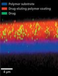 In Raman imaging, a complete spectrum is acquired in as little as 760 ms at each image pixel resulting in images consisting of tens of thousands of Raman spectra being collected in less than a minute. Differences in chemical composition will be apparent in the Raman image and can be analyzed with a spatial resolution down to 200 nm. With the various algorithms coming with the integrated software package it is possible to visualize additional material properties such as stress fields or crystallinity. For objective and chemometric data evaluation the optional cluster analysis allows the computerized unveiling of hidden structures automatically. Using the sensitive setup of the alpha300 and alpha500 can also be an advantage when performing measurements on delicate and precious samples requiring the lowest possible levels of excitation power. Figure 1a shows an electron micrograph of a polymer coated drug eluting stent. To characterize such coatings, nondestructively confocal Raman imaging provides the ability to analyze the chemical composition and spatial distribution of the material within the coating. Due to the confocal principle even the thickness of these coatings can be measured. In Figure 1b the Raman spectral image of a coating on a stent is shown. In this case the confocal Raman microscope was used to perform a depth scan along the x–z axis through the coating.