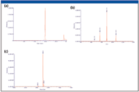 While HPLC–UV data are important for high-level quantitative studies, higher sensitivity and identity data for ADME studies usually are obtained from LC–MS analysis. Figure 3 shows a typical example of an LC–MS analysis. A 19mer phosphorothioate oligonucleotide was extracted from plasma using Clarity OTX and analyzed on the Oligo HTCS LC–MS system. Figure 3a is the TIC chromatogram of the plasma-extracted oligonucleotide and demonstrates high recovery and complete removal of any MS-interfering plasma matrix contaminants. The isolated MS spectra of the main 19mer oligo peak at 14.3 min retention time is shown in Figure 3b. Major ions corresponding to the –6, –7, and –8 ions of the parent oligonucleotide are readily seen. Because oligonucleotides typically are observed as a mixture of negatively charged ions, deconvolution software is needed to positively identify all components in a sample. In Figure 3c, the deconvoluted MS spectrum is shown. Note the minor components that correspond to low-level sodium adducts as well as a small amount of depurination; these results show the necessity of using deconvolution software for identifying impurities and metabolites.