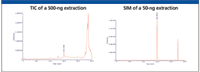 Figure 4: Aliquots of 500 ng and 50 ng spikes in plasma were extracted using Clarity OTX to determine sensitivity limits. A TIC of the 500-ng load is shown on the left. The 14.3-min peak corresponding to the 19mer P-S can still be quantitated. While a peak is not observed for the TIC of the 50 ng load, using a SIM at m/z of 944 (the â7 charge state) as is shown on the right, one still can readily quantitate the oligonucleotide at even lower levels.