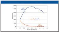 Optimization of the oxygen gas flow for the conversion of 75As+ to 75As16O+ is shown in Figure 4. It is clearly evident that as the O2 flow increases, the 75As+ signal decreases, while the 75As16O+ signal increases, up to a flow of 0.45 mL/min, at which the difference in signals is at a maximum.