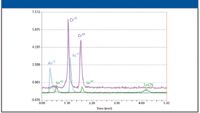 The chromatograms for a 1-μg/L mixed standard containing the species of interest are shown in Figures 6 and 7. These are the same chromatograms, but displayed differently: Figure 6 shows how the signals appear on the screen during an analysis, while Figure 7 shows the chromatograms separately for easier viewing. From Figure 6, the advantage of using a multielement detector is clear: because different masses are being monitored for each element, a complete separation of all seven species does not need to be obtained. For example, the peak for Cr+3 virtually overlaps the As+5 peak, while Cr+6 and Se+6 are eluted at the same time (coeluted). If a single channel detector were being used (as is common in conventional HPLC), these species could not be distinguished. However, because three masses are being monitored, species of different elements, which co-elute, can be distinguished easily.