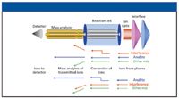 The principles of dynamic reaction cell technology have been described many times in the open literature (6–8), but a brief description follows. An enclosed rf-only quadrupole is positioned after the ion optics and pressurized with a reactive gas, such as ammonia (NH3), methane (CH4), or oxygen (O2). By a number of different ion–molecule reaction mechanisms, the gas reacts with either the interfering ions to form products that will not interfere with the analyte, or with the analyte to form a polyatomic ion at a different mass, away from the interference. The analyte mass then emerges from the dynamic reaction cell free of its interference and is guided into the analyzer quadrupole for conventional mass separation. These processes are represented schematically in Figure 3. By optimizing the reaction cell quadrupole electrical fields, unwanted reaction by-products, which could potentially lead to new interferences, are prevented. This cleansing process, known as "chemical resolution," means that every time an analyte and interfering ions enter the dynamic reaction cell, the bandpass of the quadrupole is optimized for that specific mass and then changed on-the-fly for the next analyte (6). The benefit of this approach for multi-element analysis is that the instrument can be operated in both dynamic reaction cell and normal modes: different gases and gas flows can be used for elements which have interferences, while noninterfered elements can be analyzed in standard mode (that is, no reaction gas).
