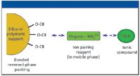 The ion-pairing reagent is a compound that has both an organic and an ionic end. To promote ionic interaction, the ionic end should have the opposite charge as that of the analytes of interest. For anionic IPC, a commonly used ion-pairing reagent is tetrabutylammonium hydroxide (TBAOH) and, for cationic IPC, hexanesulfonic acid (HSA) often is chosen. In principle, the ionized–ionizable analytes interact with the ionic end of the ion-pairing reagent, while the ion-pairing reagent's organic end interacts with the C18 stationary phase. Retention and separation selectivity are primarily affected by characteristics of the mobile phase, including pH, selection–concentration of ion-pairing reagent, ionic strength, as well as the use of additional mobile phase modifiers. With this scheme, an RP column acts like an ion-exchange column.