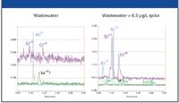 Figure 9 displays chromatograms of a municipal wastewater sample. This sample was filtered (to remove particulates) before undergoing the sample preparation procedure described earlier. The chromatogram on the left shows the presence of trace levels of both Cr species, a high level of As+6, and a peak for selenium that could possibly be Se+6. With HPLC–ICP-MS detection, the peaks are identified by matching retention times of the sample to those in a standard. In this sample, the retention time of the unknown Se peak is close to that of Se+6, but does not match exactly. It is fairly common to see slight retention-time shifts in a sample (as compared with the standard) due to the sample matrix.