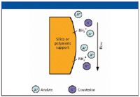 The principle of IEC is represented schematically in Figure 1 for an anion exchange scheme. In this figure, the anions are denoted by A– and represent the analyte species, while the counterions are symbolized by X–. The main benefit of this approach is that it has a high tolerance to matrix components, while the main disadvantages are that these columns tend to be expensive and are somewhat fragile.
