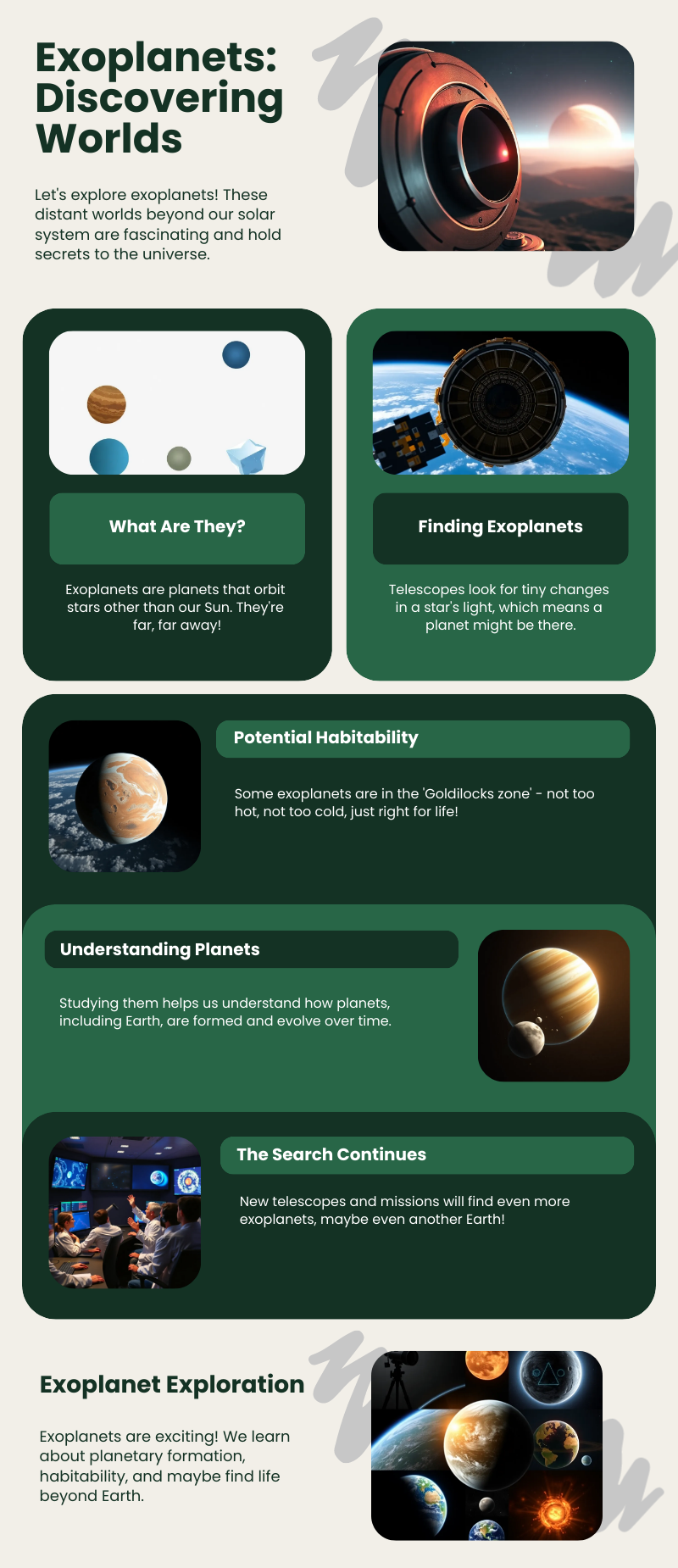 This newsletter provides an overview of exoplanets. Generated by AI courtesy of Piktochart.