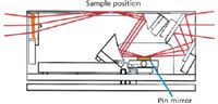 The hard disk samples HD1, HD2, and HD3 were analyzed in grazing angle reflectance mode using the grazing angle accessory. This accessory is designed to optimize grazing angle measurements at 80°. Figure 1 shows the optical design (1) of the accessory, in which the beam from the spectrometer is focused onto a circular pin mirror. The reflected beam from this mirror strikes the sample at an 80° angle of incidence. The area of the sample that is being measured is equivalent to the size of the circular pin mirror, in this case, a 0.5-in. diameter spot size.