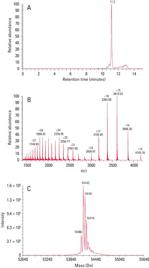 The ~55 kDa BiTE and parent mAbs (data not shown) were subsequently injected onto a TSKgel UP-SW3000 column coupled to a mass spectrometer for molar mass determination. Figure 1 shows the (a) total ion chromatogram, (b) mass spectrum, and (c) deconvoluted mass spectrum of the BiTE. A main peak can be seen at m/z 54,143; adjacent peaks at m/z 54,181, 54,219, and 54,086 correspond to different salt adducts.