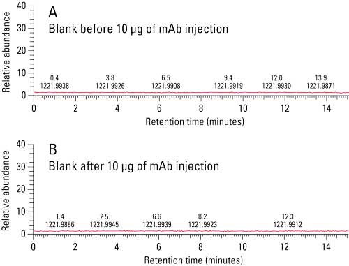 Prior to analysis, a blank injection was run in order to assess column particle shedding. Figure 2a shows the total ion chromatogram of a blank injection. MS data indicates that there is no shedding from the TSKgel UP-SW3000 column prior to sample injection. Additionally, a blank injection was run between each of the sample injections in order to monitor sample carryover. Figure 2b shows the total ion chromatogram of a blank injection run between the BiTE and parent mAb showing no evidence of carryover.