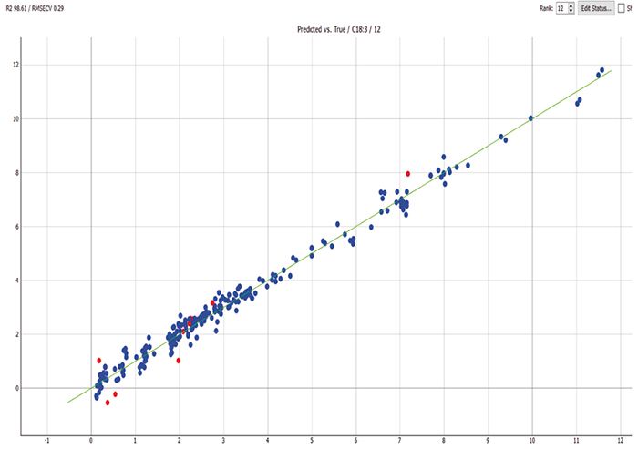 The cross-validation results of iodine value (IV) and linolenic acids calibrations are displayed in Figure 2 and Figure 3, respectively.