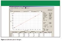 The instrument was calibrated and the samples were run in one continuous run. The calibration plot of nitrogen is shown in Figure 2. From this plot, it is possible to check the performance of the calibration standards onscreen by checking the percentage difference between the stated and the actual concentrations. The plot also depicts the correlation coefficients.