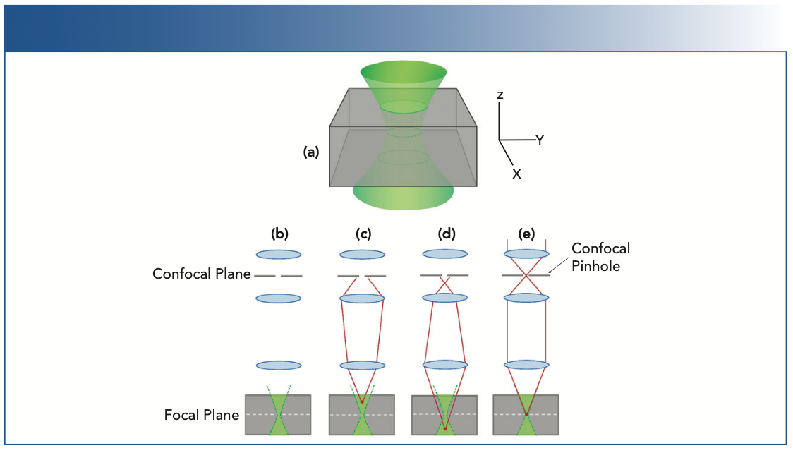 FIGURE 2: Role of the confocal pinhole in a Raman microscope: (a) representation of the excitation 3D point spread function, (b) excitation cone induces Raman scattering throughout the sample volume, (c) Raman scatter originating from above the focal plane is rejected by the confocal pinhole, (d) Raman scatter originating from below the focal plane is rejected by the confocal pinhole, (e) Raman scatter originating from the focal plane is passed through the pinhole and enters the spectrograph for detection.