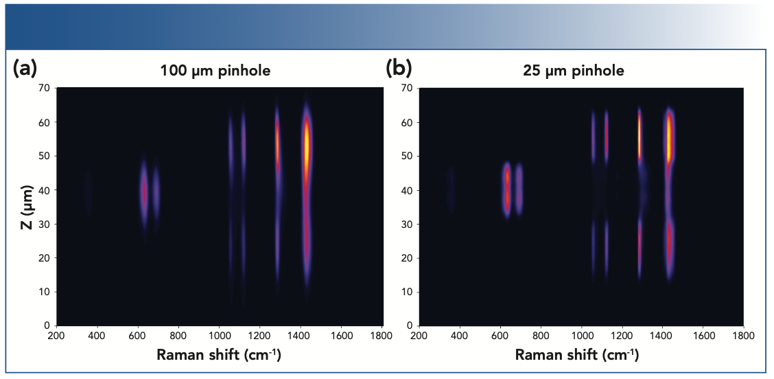 The addition of the pinhole allows for 3D analysis, which is particularly useful for multilayer samples, such as composite plastics. The polyethylene terephthalate (PET) and polyvinyl chloride (PVC) polymers have unique Raman spectra, and the Raman depth profile can identify the discrete layers within the PET-PVC-PET polymer stack. It can clearly be seen in Figure 3 that, as the diameter of the pinhole is decreased from 100 μm to 25 μm, it becomes increasingly effective at blocking the out-of-focus scatter (increased confocality), and the effective axial resolution improves. Using narrow pinhole diameters, axial resolutions of <1 μm can be achieved. The tradeoff with narrowing the pinhole diameter is that the throughput of the microscope is significantly lowered, and measurements will therefore take longer, due to decreased Raman scatter intensity at the detector. Due to this tradeoff, most Raman microscopes use a variable diameter confocal pinhole enabling the microscope mode to be adjusted from high confocality/low throughput to non-confocal/high throughput, depending on the application.