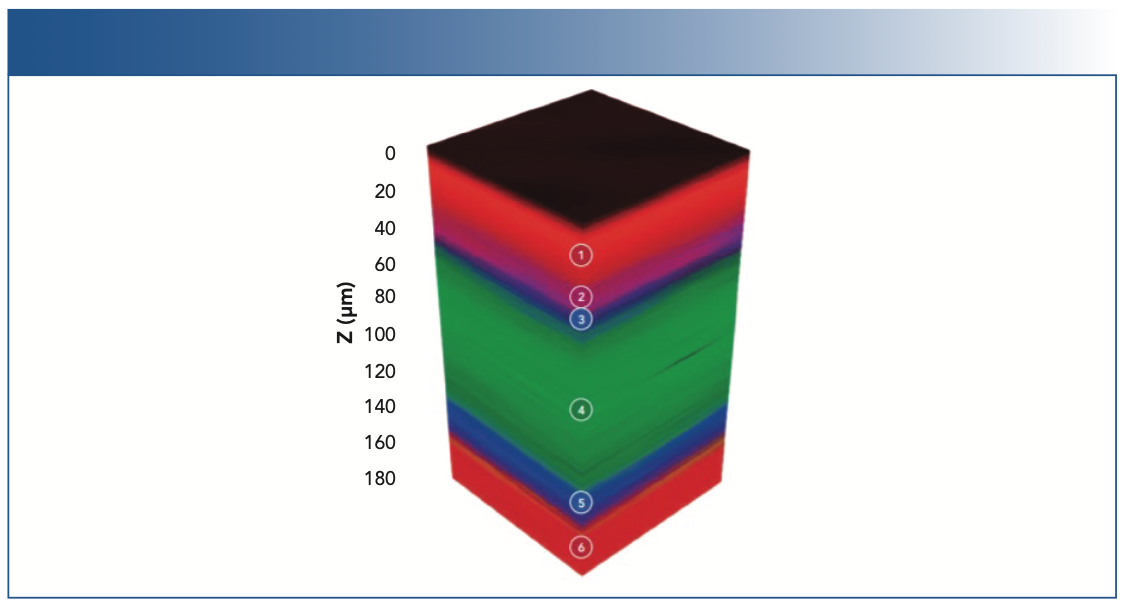 The transdermal patch analyzed contained nicotine as the active ingredient, surrounded by polymers. By carrying out a Raman 3D map, we can visualize the different material layers present in the patch, shown in Figure 4 as a 3D render.