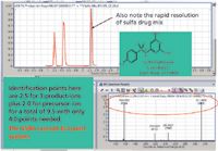 Figure 1 shows the UHPLC chromatogram for three sulfa antibiotics: sulfamethazine, sulfamerazine, and sulfadimethoxine. Two of these antibiotics (sulfamethazine and sulfamerazine) are used in hog feed at parts-per-million levels, and sulfadimethoxine is used in water for caged birds; thus, it is possible for these products to appear in food or water samples. Indeed, the presence of sulfa antibiotics is commonly reported in water samples affected by wastewater effluents. Therefore, it is important to have a method that can easily identify these compounds with a resolution that meets the European Union criteria of identification points for either food or water samples (1,2,5).