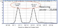 The neutral losses of N2, CH2CH2, and CO all result in a mass unit difference of 28, and perhaps, may represent one of the greatest challenges to MS-MS analysis by high resolution and accurate mass analysis (5). Nielen and colleagues (5) examined such losses in the fragmentation of stanazolol, a banned anabolic steroid that gives a series of neutral losses, with isobaric product ions that differ by the loss of either CH2CH2 or N2, which is a difference in mass between these two losses that is equal to 0.0252 mass units. In particular, they showed that both FT-MS and FT-orbital trap MS were capable of separating such differences at a resolving power of ~50,000 (FWHM) by orbital trap and ~100,000 (FWHM) by FT-MS. Furthermore, they found that this separation of isobaric products ions was not possible at that time by LC–QTOF-MS. Using high-resolution accurate-mass analysis with ultrahigh-definition LC–QTOF-MS, this separation of masses is now possible. We have repeated their experiment with stanazolol, conducting both chromatography and MS-MS at >40,000 (FWHM) maximum mass resolving power at m/z 1521 by LC–QTOF-MS with ultrahigh-definition mass resolution. The exact masses of the product ions for stanazolol (m/z 329.25874) are shown in Figure 4 at m/z 161.1073 and m/z 161.1325. Figure 5 shows the measured accurate mass for these two product ions using ultrahigh-definition LC–QTOF-MS. These ions represent isobaric fragments that differ by the mass difference of CH2CH2 and N2. The exact calculated mass difference between these two neutral losses is 0.0252 mass units versus the measured mass of 0.00249. Table I shows the 10 isobaric losses that occur within the stanazolol molecule when the MS-MS experiment is carried out. Note that the average mean loss for all of the fragments is 0.0252, which exactly matches the calculated mass difference between CH2CH2 and N2, with a standard deviation of 0.0002 mass units, which is less than 1%. The accurate mass for all fragments is approximately 1 ppm across the mass range and resolving power is approximately 25,000 (FWHM) for the smallest fragments, which is illustrated in Figure 5. Thus, LC–QTOF-MS has met the challenge presented by stanazolol and the European Union regulation of high-resolution MS in both accurate mass and resolving power. The banned anabolic steroid, stanazolol, could be positively identified with these product ions and its MH+ by high resolution, thus satisfying the EU requirements of having more than 4.0 identification points. In fact, these data are equal to 2.0 + 10(2.5) points, for a total of 27.0 identification points. These data answer the question in the title of this article of how much resolving power is enough for small molecules of less than 500 molecular weight, at least with respect to the European Union regulations, which are a well thought out definition for high-resolution MS (8).