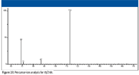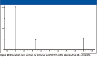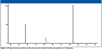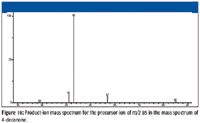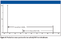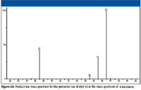 The product-ion mass spectra obtained in this study were produced by a tandem-in-space triple quadrupole mass spectrometer. In such an instrument, product ions formed from the precursor ion isolated by Q1 (MS1) can themselves undergo subsequent collisionally activated dissociation (CAD) in the collision cell (q2). The conversion of precursor ion to product ion is not 100% during the acquisition of the product-ion spectra. The displayed product-ion mass spectrum may contain peaks representing precursor ions, primary product ions, secondary product ions, and tertiary product ions. This fact is an important consideration in the evaluation of these mass spectra.