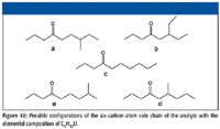 If this were a mass spectrum of an unknown compound, at this point it could be rationalized that the analyte was an aliphatic ketone with the carbonyl on the number 4 carbon atom. The analyte has a nominal mass of 156 Da. The three carbon atoms on the small side of the molecule constitute an n-propyl group. The next step is to determine the arrangement of the six carbon atoms on the other side of the carbonyl. The number of possible arrangements is limited considering the requisite of the analyte having two sets of γ hydrogens. The possible configurations of the six-carbon-atom side chain of the analyte are shown in Figure 10.
