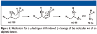 Consider the mass spectrum of 4-decanone (Figure 7). The M+• peak is at m/z 156. This is consistent with the nominal mass of the analyte being 156 Da. There appear to be two odd-electron ion peaks in the mass spectrum; one at m/z 86 and the other at m/z 58. If this were an unknown spectrum, the peak at m/z 58 would indicate that the analyte might be an aliphatic ketone. The fact that there are two odd-electron ion peaks indicates that there are two sets of γ hydrogens to participate in a γ-hydrogen shift-induced β cleavage. The molecule lost to form the first odd-electron ion has a mass of 70 Da. Assuming that this molecule is an olefin, it will contain five atoms of carbon. The olefin will have the general formula of CnH2n, which means that there are n CH2 units. Dividing 70 by 14 yields the integer 5. The so-called McLafferty Rearrangement (shown in Figure 8) indicates that to have a loss of 70 Da, there must be six atoms of carbon on one side of the carbonyl.