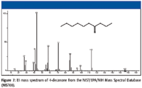 A search of the NIST08 Mass Spectral Database for spectra containing a peak at m/z 113 representing an n-hexyl acylium ion resulted in a list of 15 compounds in addition to 4-decanone. All of these spectra exhibited peaks at m/z 95 and m/z 69 with intensities similar to those for peaks at these same m/z values in the spectrum of 4-decanone.