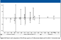 It should also be noted that the intensity of the molecular ion peak in the spectrum of 8-methyl-4-nonanone is almost an order of magnitude greater than that of the molecular ion peak for 4-decanone. The intensities of most of the other peaks in the spectrum of 8-methyl-4-nonanone relative to the base peak at m/z 43 are much greater than those in the spectrum of 4-decanone. The NIST Mass Spectral Database Archive has only one spectrum for 8-methyl-4-nonanone, and this spectrum may be saturated (evidence is presented later). There are multiple spectra for 4-decanone in the Database Archive, and all show similar intensities to one another; therefore, it is more likely that the spectrum of 4-decanone is more representative of the true spectrum than is the spectrum of 8-methyl-4-nonanone.